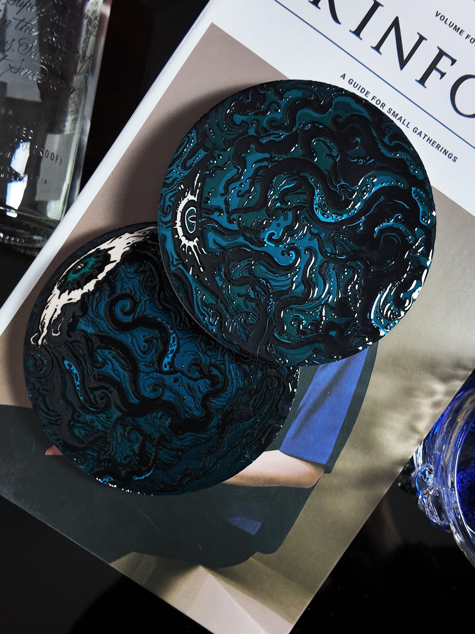 Crafted with durability and style in mind, this coaster is perfect for fans of Lovecraftian aesthetics, collectors, or anyone who enjoys distinctive themed decor. Ideal for both everyday use and display.
