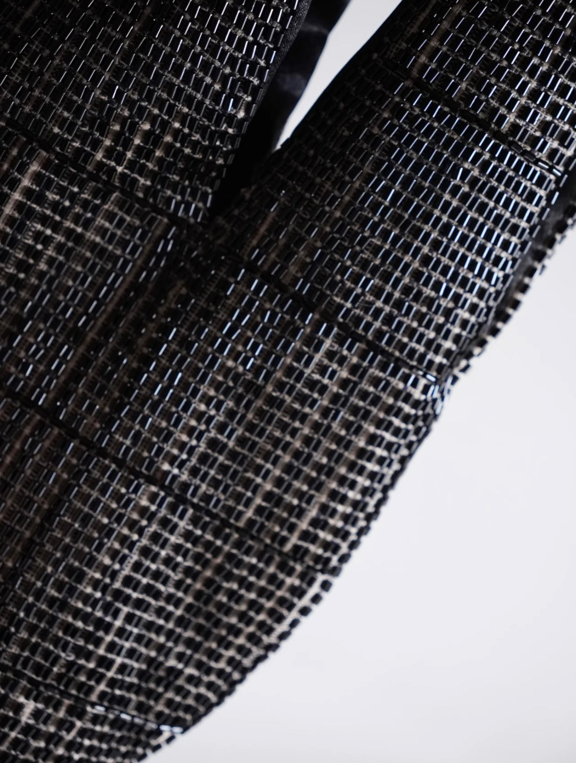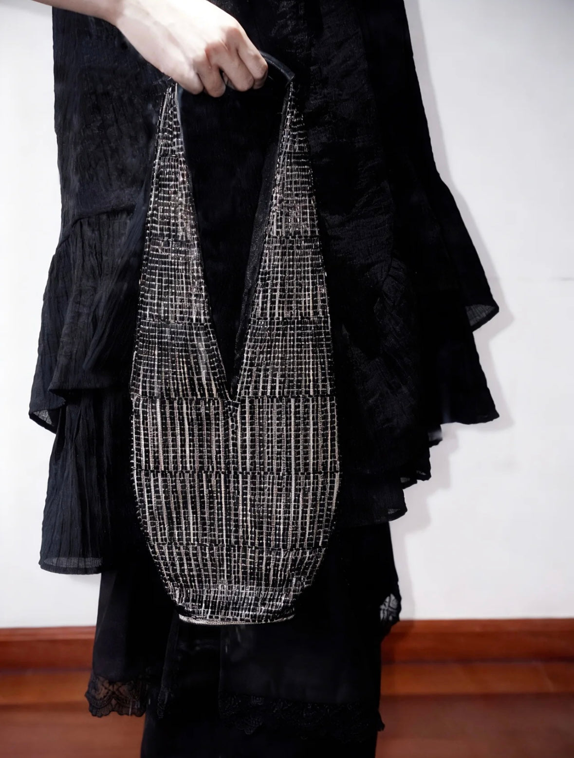 Handwoven with delicate glass beads, this bucket-style bag blends art and elegance.