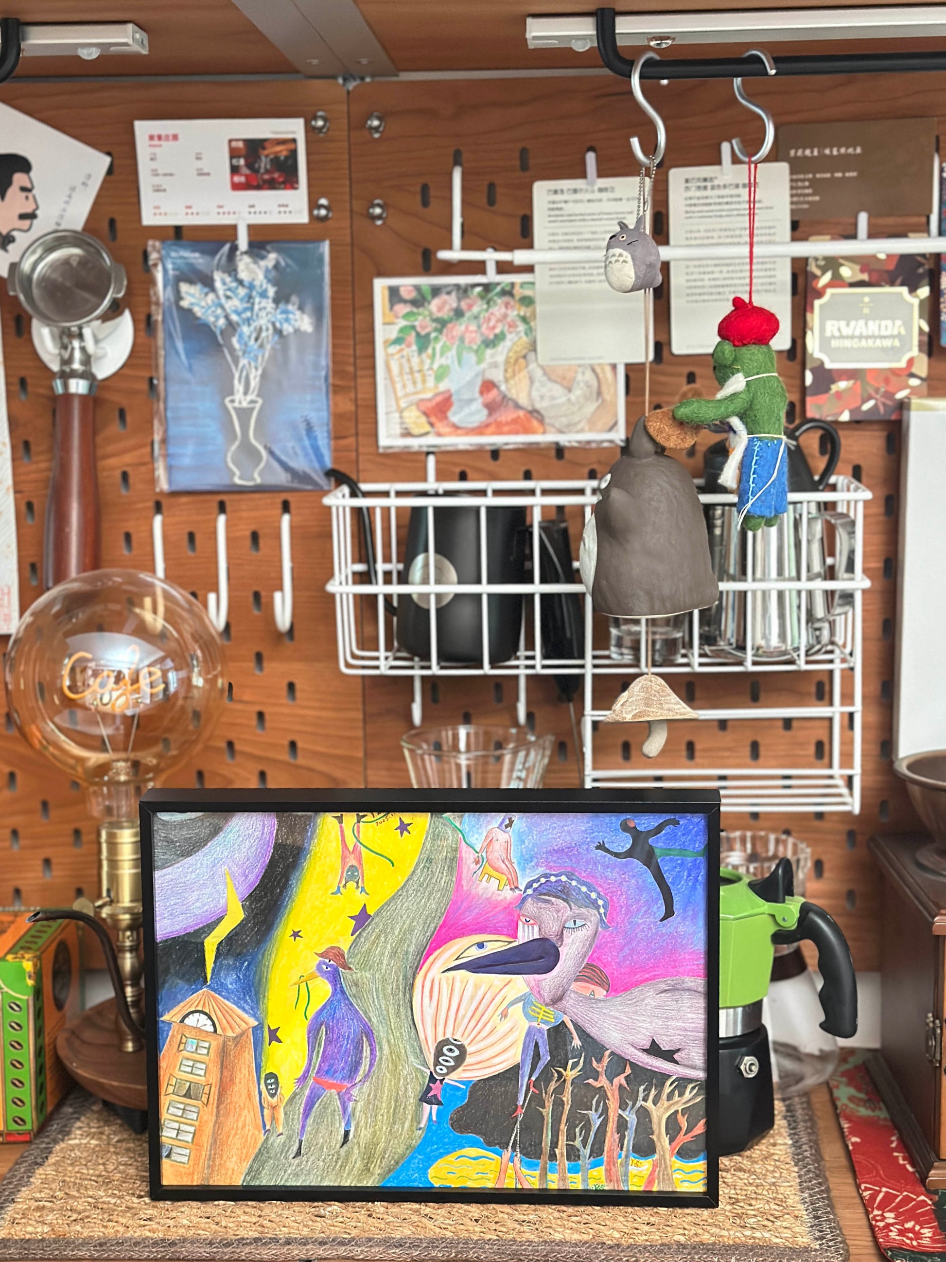 The painting unfolds like a memory suspended in motion, blending whimsy and melancholy into a vivid exploration of awakening and imagination.
